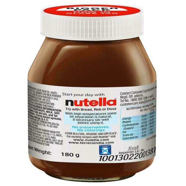Spread Happiness in the Morning! Nutella Ferrero Hazelnut Spread With Cocoa is made of premium quality ingredients like selected hazelnuts and delicious cocoa. It is free from artificial colours, preservatives. Nutella helps a mom make breakfast tastier and makes it more enjoyable for kids. It also offers a sensorial experience that allows a moment of joy for the family. It's perfect for your bread, pancakes, rotis and dosas. It's a treat in sandwiches and makes brilliant icing for cakes and cupcakes. So what are you waiting for? Go ahead, buy Nutella Ferrero Hazelnut Spread With Cocoa online today!